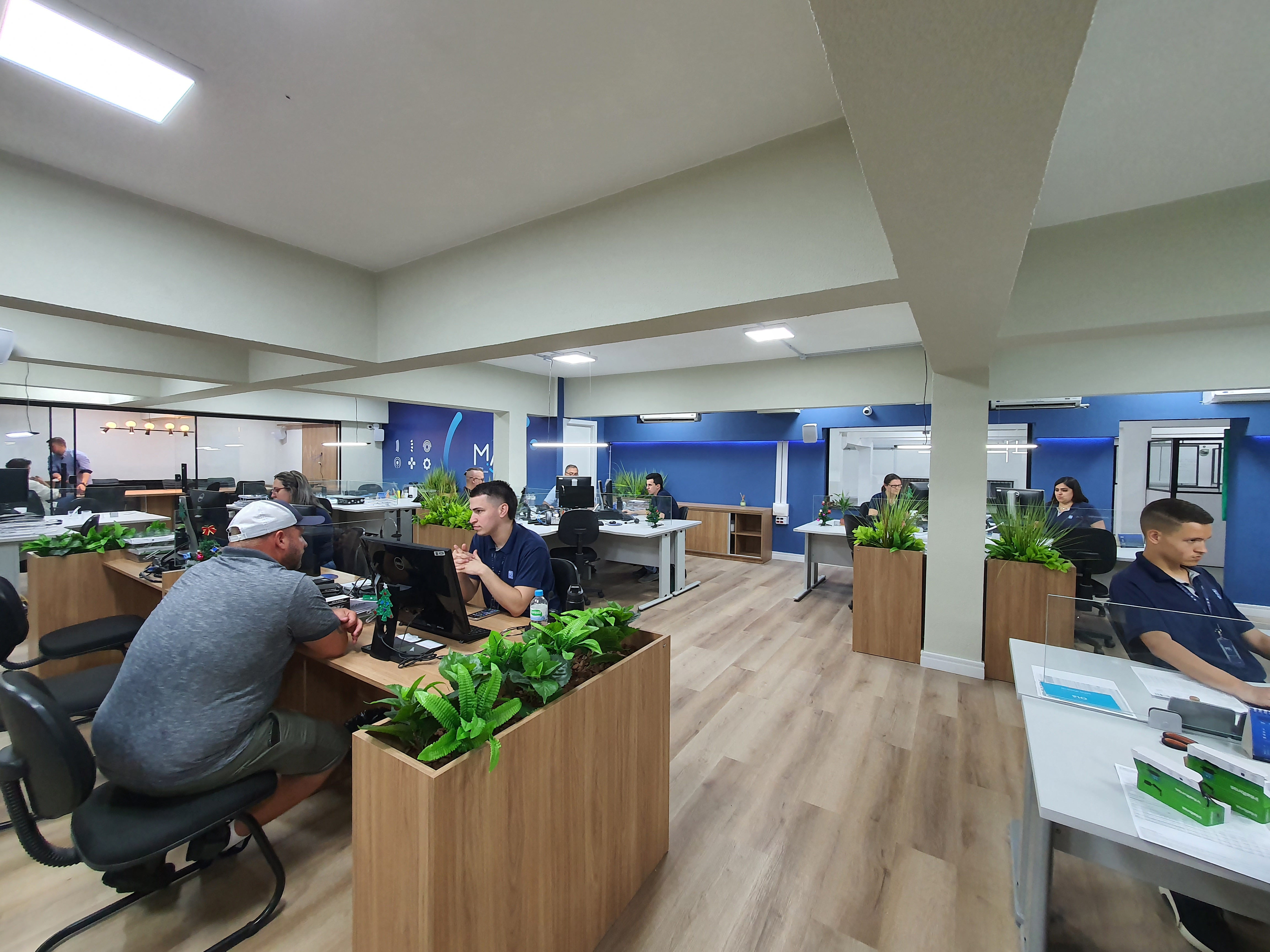 A reforma incluiu instalação de divisórias em vidro e alumínio, novo piso vinílico, iluminação em LED, pintura, reconfiguração de layout e implementação de paisagismo interno, com floreiras integradas ao mobiliário. O resultado é um ambiente sofisticado, que valoriza o bem-estar dos colaboradores e proporciona uma melhor experiência aos clientes.