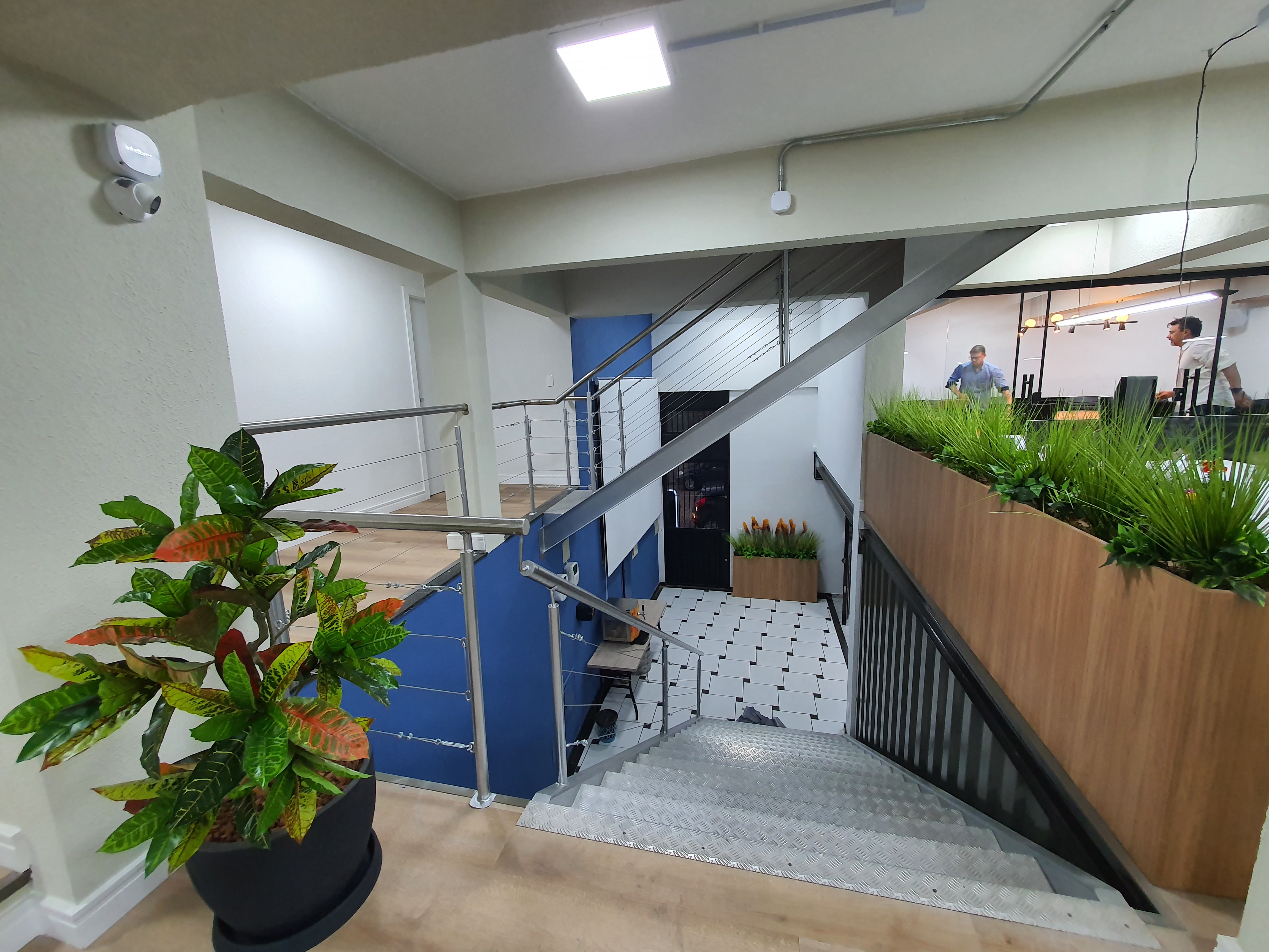 A escada de acesso ganhou novo revestimento e corrimãos em aço inox, criando um eixo de circulação mais moderno e seguro. A recepção e os espaços de espera agora contam com mobiliário sob medida, iluminação indireta e elementos visuais alinhados à marca da empresa.